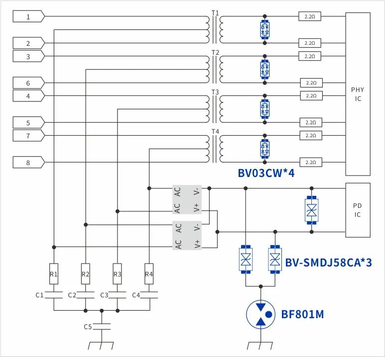 POE,即Power Over Ethernet的簡稱,根據系統組成,主要分為PD和PSE兩個大部分,其中,PD(power device)即受電設備,負載端,常見的如IPC、AP等;PSE(power supplier)即供電設備,常見的如POE交換機等。