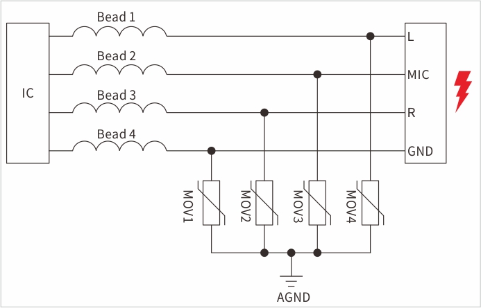 原理如(圖2),左邊是音頻解碼芯片,客戶串聯30歐姆的磁珠,接口采用高VC低IPP封裝0402的壓敏器件,右邊是耳機音頻接口。