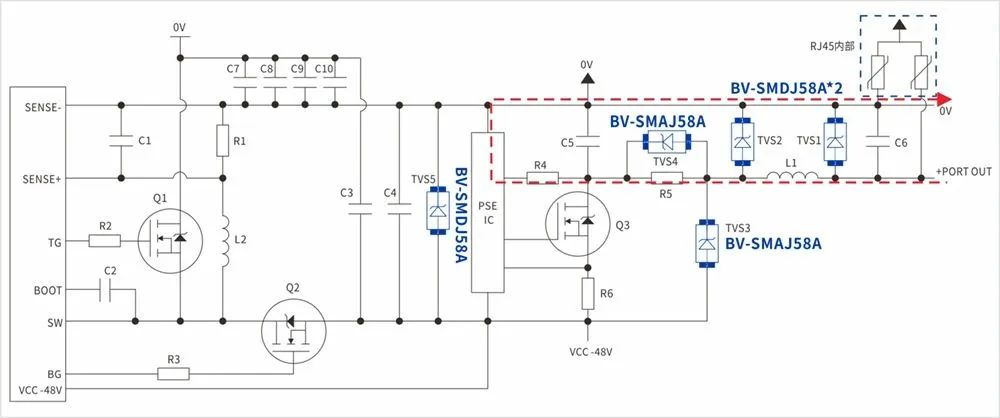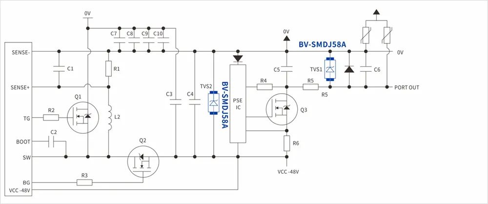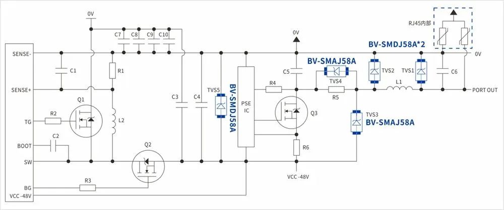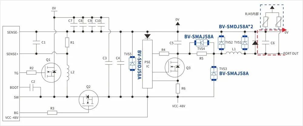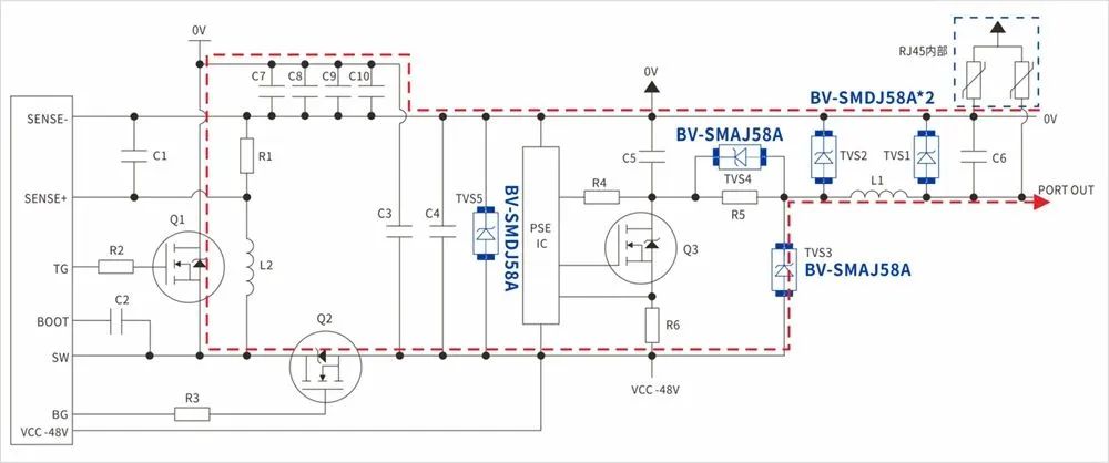 某客戶,在按照ITU-T K.21測試要求的測試應力測試POE網口時,出現POE網口損壞。表現為PSE IC損壞,無輸出。其防護的電路基本框圖如下: